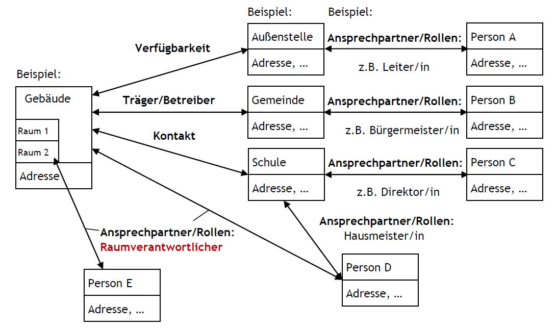 • Kontakte zueinander in Beziehung gesetzt werden. Relevante Rollen sind hier z.B. Mitarbeiter, Direktor, Hausmeister, Erziehungsberechtigter, ...
