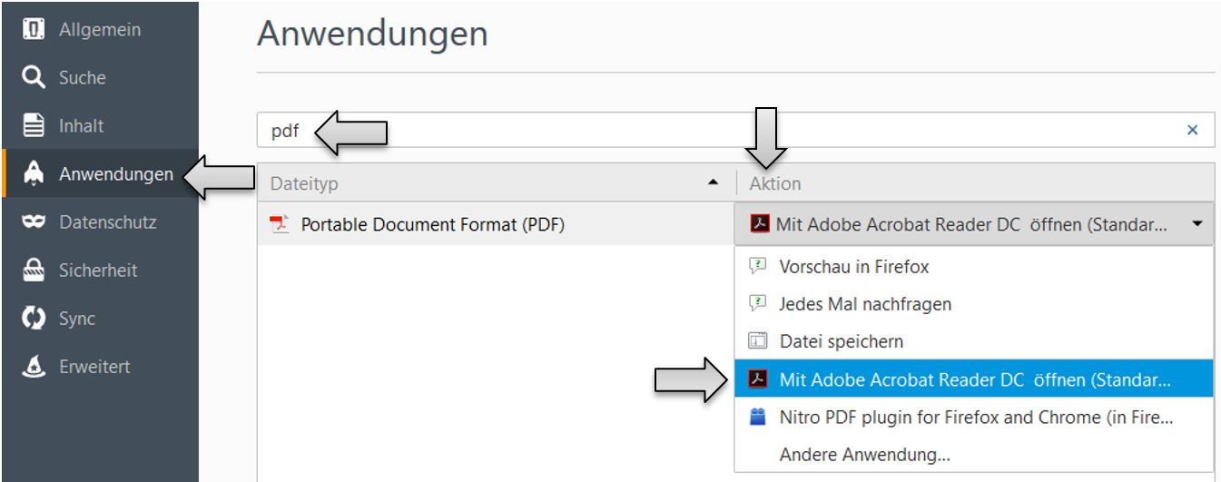 3. Stellen Sie sicher, dass unter Aktion „Adobe Acrobat (in Firefox) verwendent“ hinterlegt ist. Sollte dieser Eintrag nicht verfügbar sein, wählen Sie den Eintrag "Mit Adobe Acrobat Reader ... öffnen (Stand..." aus.