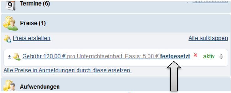 „Festgesetzt“ erscheint hinter dem Preis, wenn dieser abgerechnet ist (Bsp. Alle Anmeldungen einer Veranstaltung sind abgerechnet oder die Eigenschaft "abrechnen" der Anmeldungen steht auf "ja").