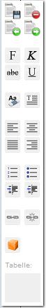 Auf der linken Seite des Editors finden Sie eine Symbolleiste. Diese enthält neben den Buttons "Text abspeichern" und "Textverarbeitung abbrechen" die Möglichkeit, Eingaben rückgängig zu machen oder diese zu wiederholen.