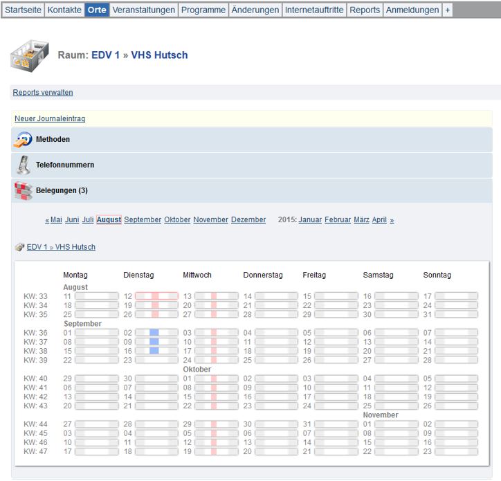 In der Applikation „Belegungen“ werden Belegungen durch Veranstaltungen in blauer Farbe und Belegungen durch Sperrungen in roter Farbe angezeigt.