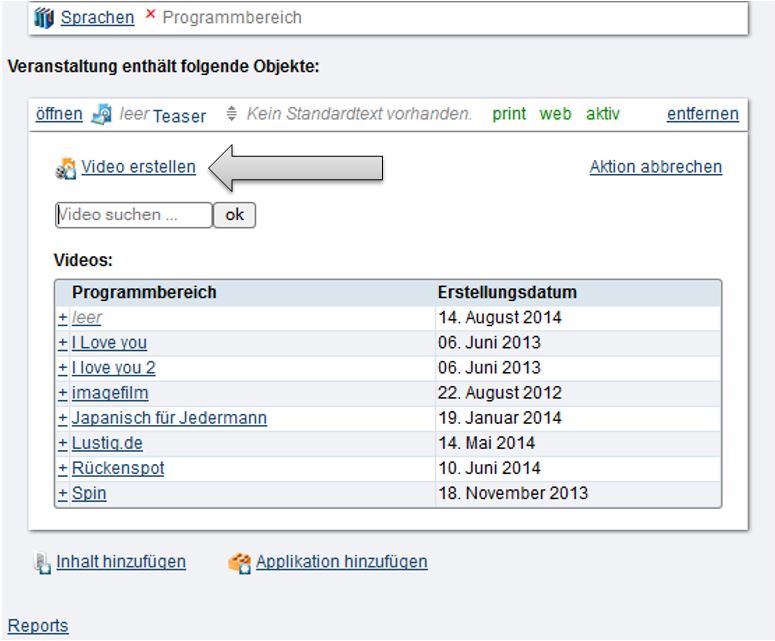 Ein Video können Sie über die Applikation „Inhalte“ in der jeweiligen Veranstaltung hinzufügen. Sie wählen dort „Inhalt hinzufügen“ und danach „Video“ und „Video erstellen“ aus, sollte das einzufügende Video noch nicht gespeichert worden sein oder Sie die URL/Webadresse des Videos haben.