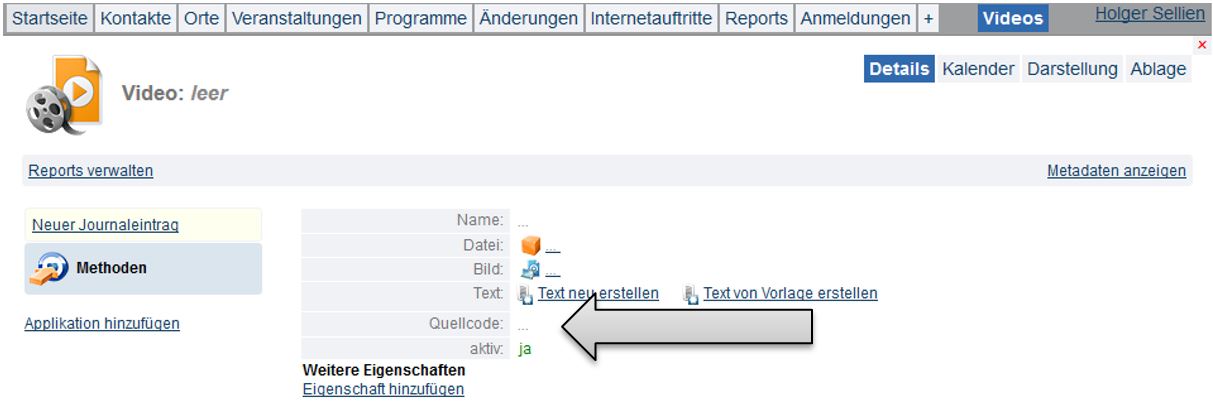 Nun vergeben Sie einen Namen für das Video und tragen bei der Eigenschaft „Quellcode“ die URL/Webadresse des Videos ein. Einen Quellcode können Sie sich z.B. für Videos bei YouTube unter „Teilen => Einbetten => Quellcode“ erzeugen.