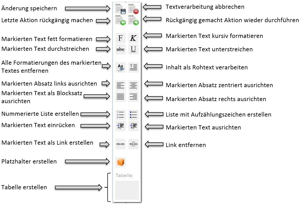 Auf der linken Seite des Editors finden Sie eine Symbolleiste. Diese enthält neben den Buttons „Text abspeichern“ und „Textverarbeitung abbrechen“ die Möglichkeit, Eingaben rückgängig zu machen oder diese zu wiederholen.
