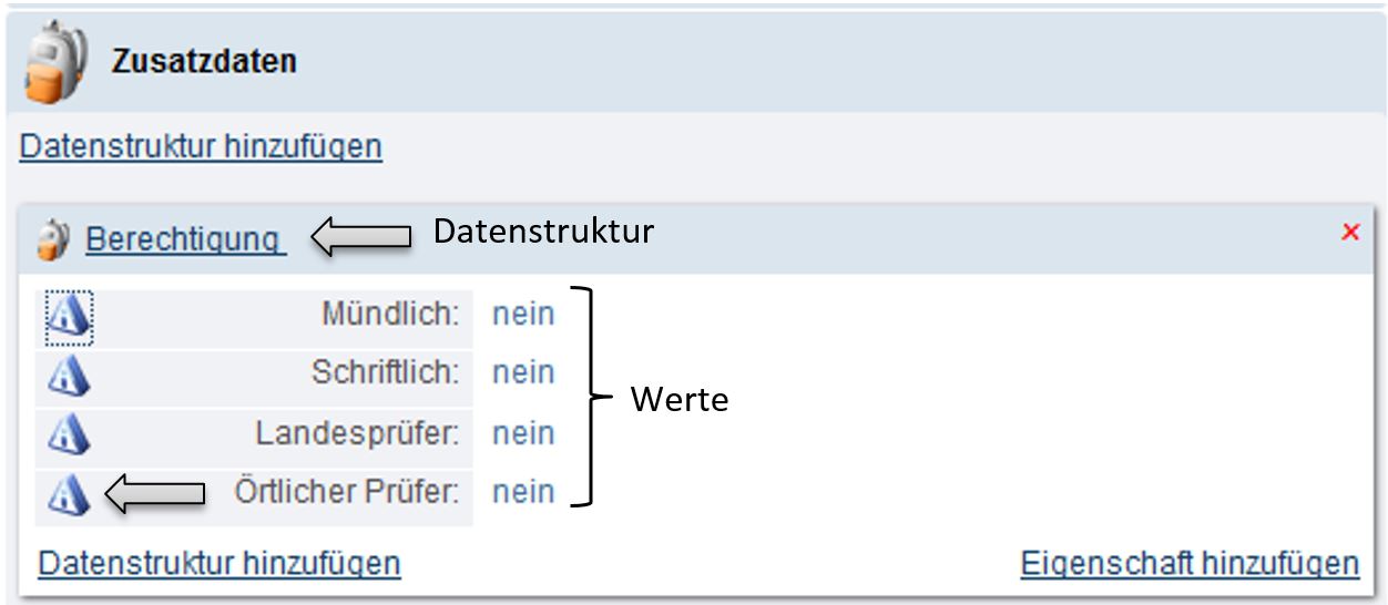 Platzhaltern können Werte aus Datenstrukturen darstellen. Die Datenstrukturen werden in der Applikation „Zusatzdaten“ angezeigt.