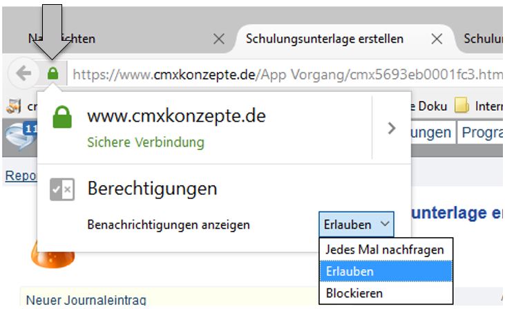 Damit Systemmeldungen angezeigt werden, müssen webnotifications erlaubt werden. Daher prüfen Sie vor dem Arbeiten mit cmxOrganize, ob die webnotifications Ihres Browsers aktiviert sind. Dies können Sie kontrollieren, indem Sie das Schloß-Symbol links der Webadresse anklicken.