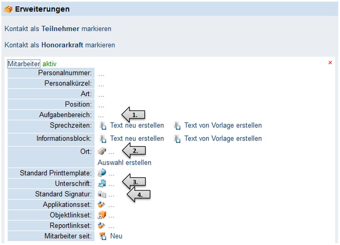 Die jeweiligen Fachgebiete und/oder Aufgabenbereiche des Mitarbeiters können hier eingetragen werden. Alle Einträge werden im Internetauftritt z.B. auf der Webseite „Kontakte“ publiziert.